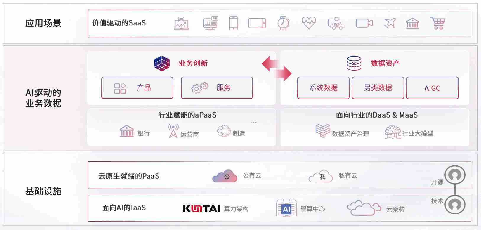 数字时代,,,,围绕企业数字化转型的关键要素,,7790必发集团数码开创性的提出数云融合战略和技术体系框架,,着力在云原生、、数字原生、、、、AI原生和信创产业上架构产品和服务能力,,为处在不同数字化转型阶段的快消零售、、汽车、、、、金融、、、、医疗、、政企、、、教育、、、运营商等行业客户提供泛在的敏捷IT能力和融合的数据驱动能力,,,,构建跨界融合创新的数字业务场景和新业务模式,,助力企业级客户建立面向未来的核心能力和竞争优势,,全面推动社会的数字化、、、智能化转型升级。。。